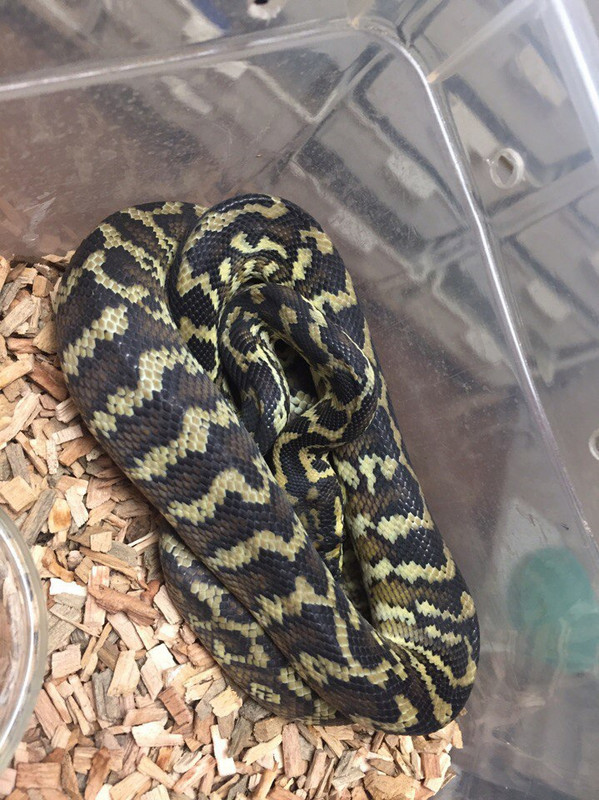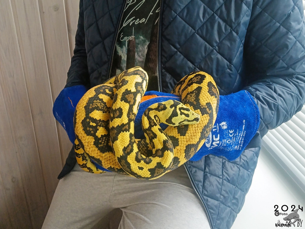 Сейчас я держу одну из самых ярких и эффектных морф коврового питона — 50% Diamond Jungle Jaguar. Эта змея действительно выделяется своей яркой, пёстрой окраской и изящным телосложением. Каждый раз, когда смотрю на неё, будто любуюсь произведением живой природы: жёлтые, чёрные и белые узоры складываются в уникальный, завораживающий орнамент.